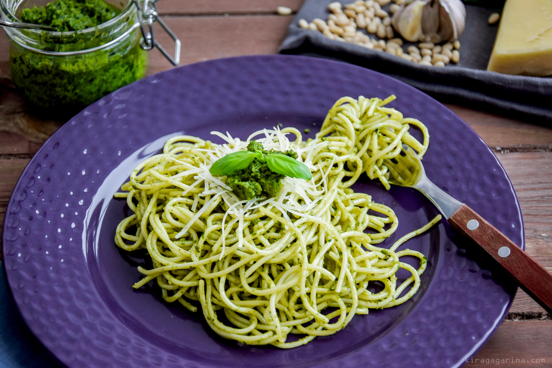 Пюрируем базилик, петрушку, чеснок, кедровые орешки миксером.