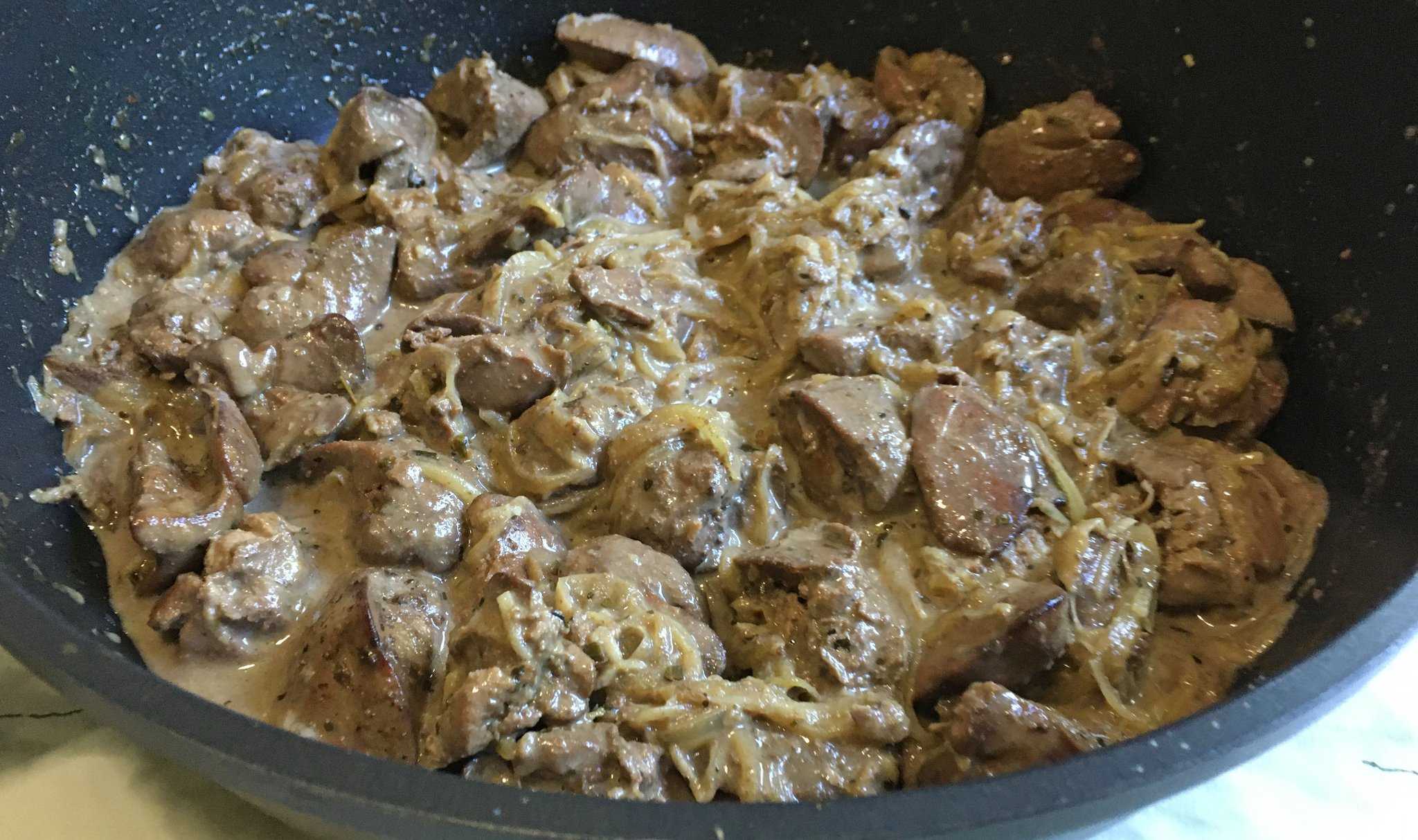 Убавляем огонь практически до минимума и выкладываем к печени сметану.