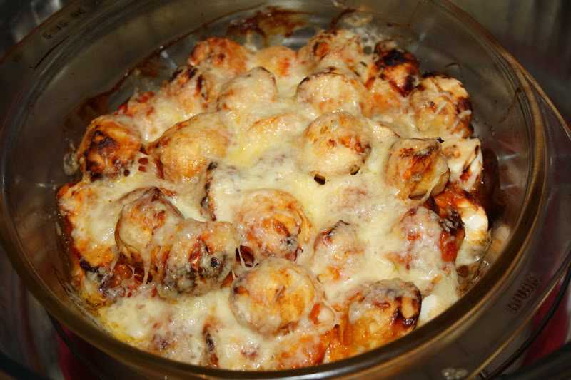 Запечённые пельмени в сметанно-томатном соусе готовы.
