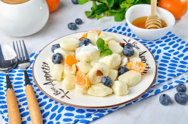 ПП ленивые вареники можно подавать с натуральным йогуртом, медом, ягодами или свежими фруктами. Для пикантного варианта используйте нежирную сметану или кефир.