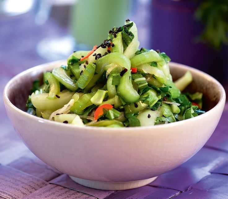 Салат с сельдереем – это прекрасная закуска для тех, кто хочет побаловать себя чем-то полезным и необычным. Он готовится за считанные минуты, а получается довольно питательным. В качестве основы закуски выступают стебли сельдерея. Этот зеленый овощ является источником ценных витаминов и минералов. В нем много растительной клетчатки, которая стимулирует кишечник и выводит шлаки и токсины из организма. Сельдерей относится к продуктам с отрицательной калорийностью. Именно благодаря этому свойству его рекомендуют диетологи включать в рацион тем, кто придерживается строгих диет и хочет сбросить лишние килограммы. На переваривание стеблей тратится больше калорий, чем в них содержится.