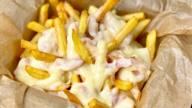 - Выложите обжаренную картошку на противень, посыпьте сыром и беконом.