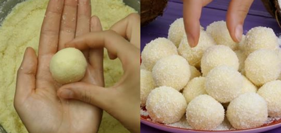 - Готовые конфеты обваляй в оставшейся кокосовой стружке.