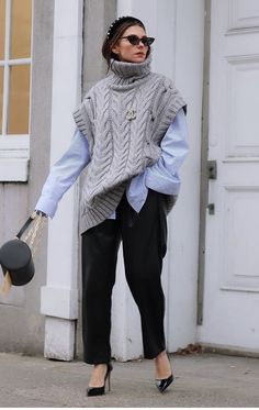 Вязаный жилет и брюки — тренд среди офисных леди. Приталенный жилет в сочетании с прямыми или широкими брюками выглядит элегантно и современно, придавая образу профессиональность. Чтобы избежать скучного вида, выбирайте модели с интересными деталями и ярких цветов. Образ дополнят лоферы или туфли на каблуке, а также сумка-портфель.
