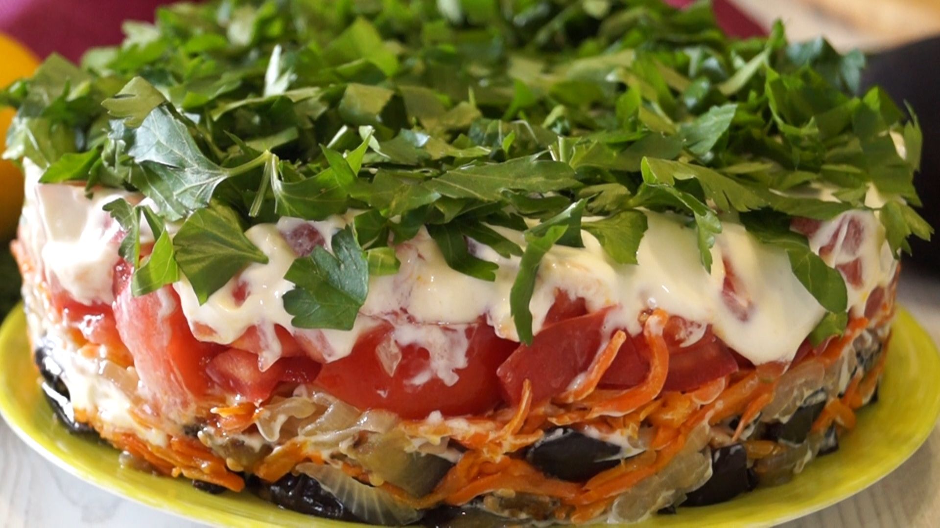 Далее повторите все слои по кругу – баклажаны – лук – морковь, смазывая ингредиенты майонезом.