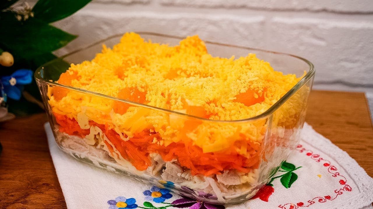 Это слоеный салат: три ингредиента — ярко желтого цвета, отчего он смотрится нарядно и привлекательно. Легкий в приготовлении, очень вкусный, из сытных продуктов. Времени на него уходит немного — подойдет на каждый день; можно приготовить заранее и дать лучше пропитаться — выручит на праздник. Если озвучить гостям название салата, вместе с аппетитом придет и хорошее настроение!)