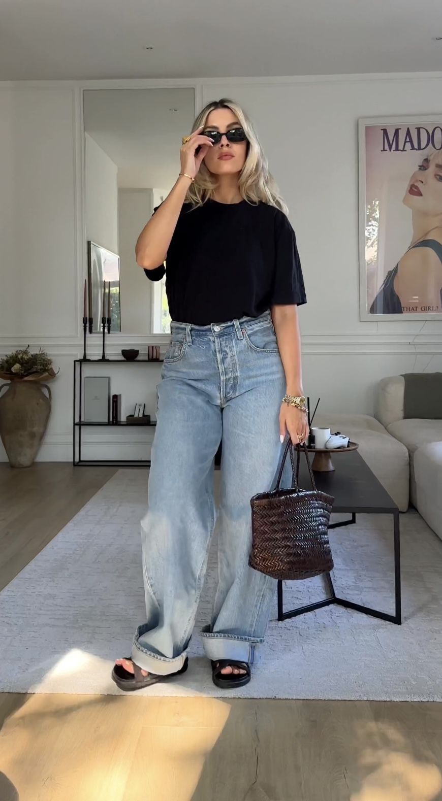 - Широкие джинсы на низкой посадке и вьетнамки на шпильке