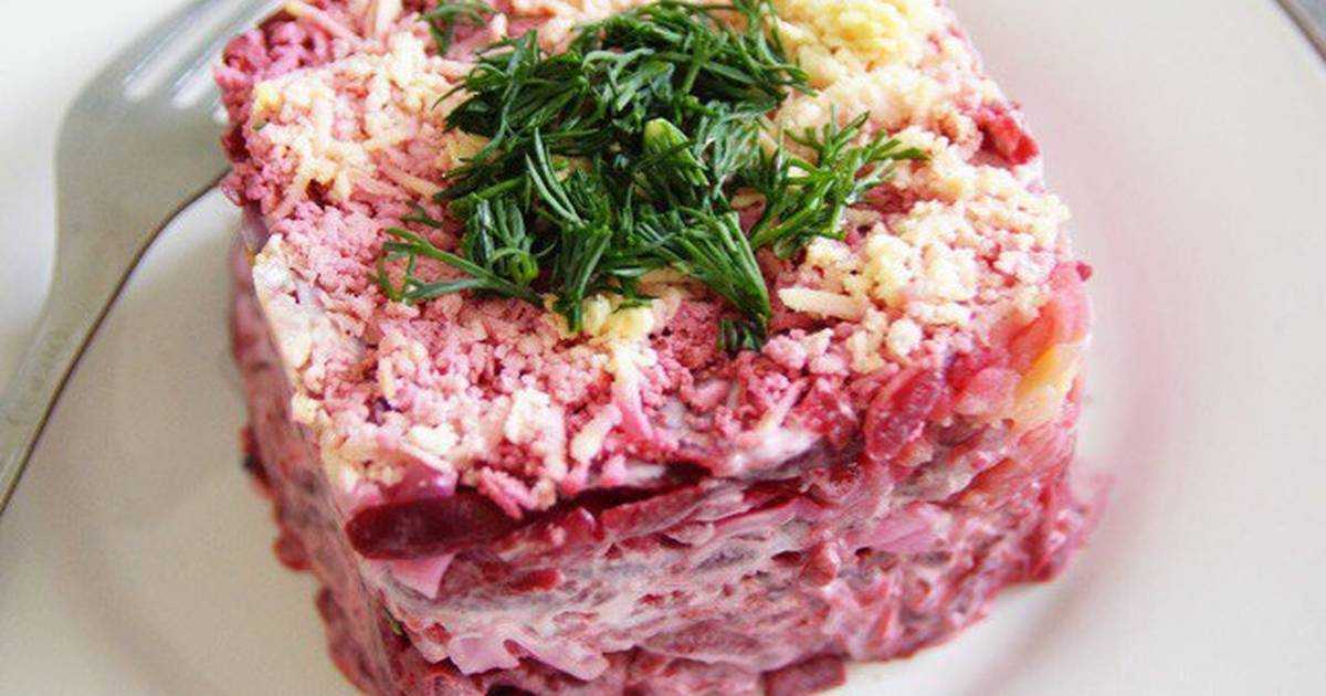 Сельдь слабосоленая филе — 400 г, язык говяжий отварной (отварная говядина) — 500 г, картофель отварной в мундире — 300 г, белок вареного куриного яйца — 4 шт., свекла отварная — 300 г, маринованные корнишоны — 200 г, яблоко зеленое — 200 г.
