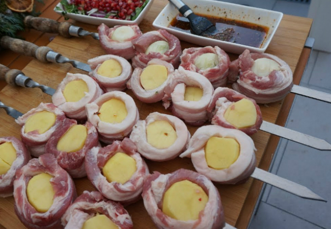 Сочный шашлык приготовим не из привычного мяса, а из картошки. Не удивляйтесь: по рецепту будем нанизывать пропитанную специями картошку на шампуры, добавим к ней немного бекона и стол еды будет готов в два счета.