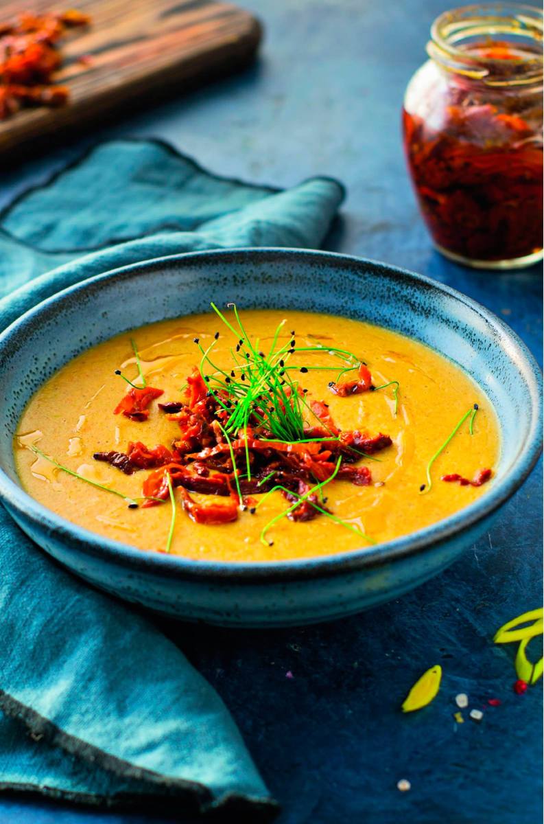 Тонко нарежьте вяленые помидоры. Разлейте суп по тарелкам, в каждую положите вяленые помидоры. Сразу же подавайте, посыпав зеленью.