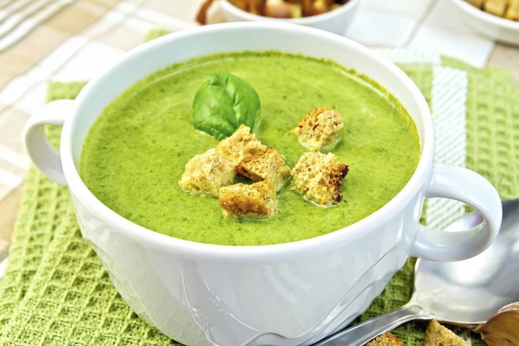 На оливковом масле в кастрюле обжариваем ломтики чеснока, затем выбрасываем их → в это масло добавляем горох, капусту, шпинат, базилик и соль → обжариваем все мин 5 под крышкой → заливаем водой и варим 20 мин → сливаем в стакан бульон, пюрируем суп блендером и разбавляем при необходимости → порционно добавляем сухарики/семечки/сливки. Готово! Приятного аппетита!