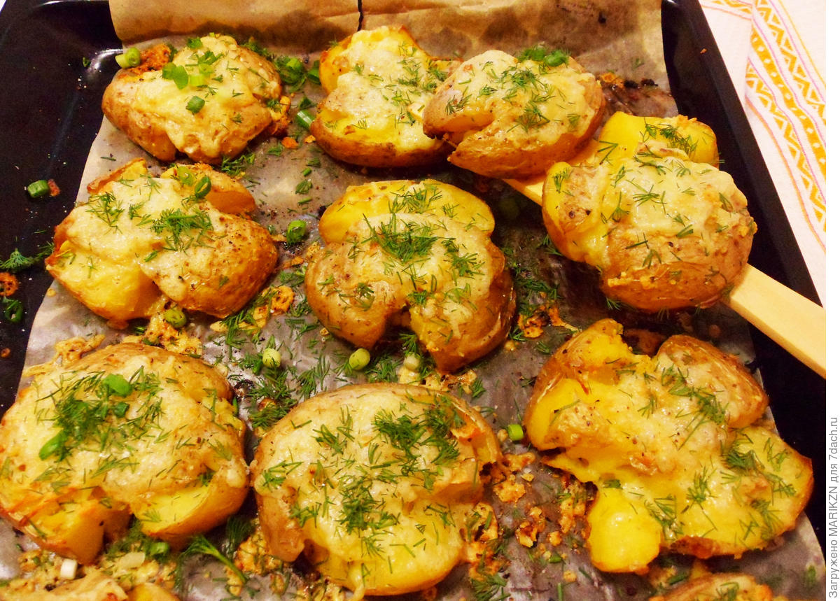 Как-то осталась у нас лишняя картошка в мундире. Много сварили и не знали уже куда деть. Салатов больше не хотелось и просто с маслом надоело. Решили запечь в духовке, прямо так, со шкуркой. И не просто, а сначала раздавить. С тех пор так часто стали делать и специально для этого варим. Показываем, какой «фирменный» гарнир у нас получается.