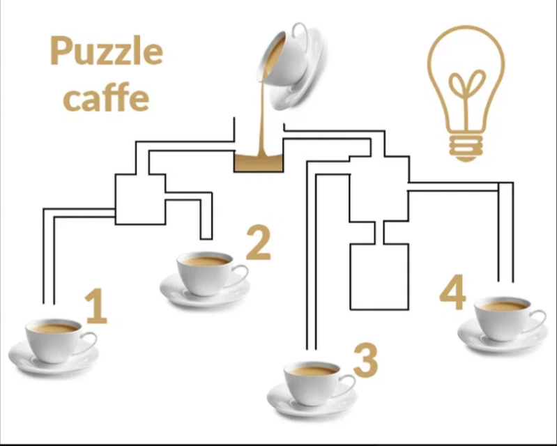 На рисунке ниже изображена одна из самых сложных головоломок. Задача состоит в том, чтобы предсказать, какая из чашек на схеме быстрее всего наполнится кофе. Для правильного ответа необходимо использовать логическое мышление и наблюдательность.