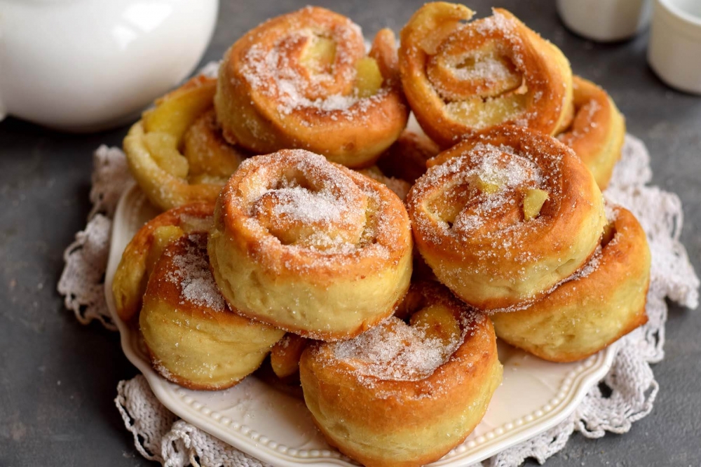 Вместо простых дрожжевых оладий можно приготовить более интересное блюдо — жареные рулетики с начинкой. Яблочные дольки заворачиваются в густое дрожжевое тесто, после нарезаются на порционные кусочки. Получаются небольшие рулетики с яблоками внутри. В период жарки дрожжевое тесто хорошо поднимается, становится пышным и воздушным. Отличная идея домашней выпечки к чашке чая.